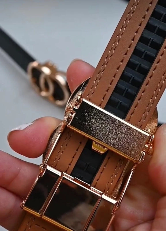 Oubliez les ceintures qui serrent, qui marquent ou qui ne tombent jamais juste. Grâce à son ajustement sans trou, notre ceinture s’adapte exactement à vous, pour un confort incomparable et une élégance naturelle au quotidien.
